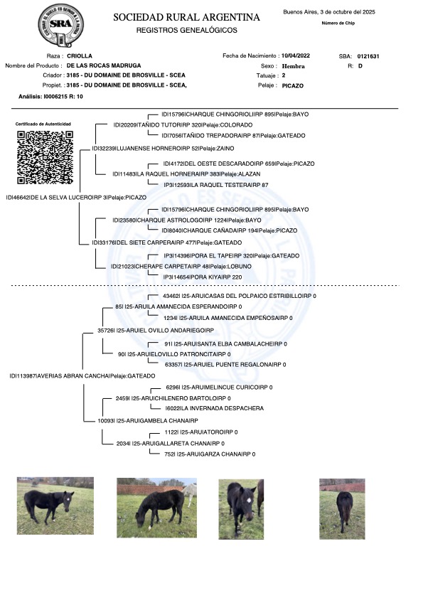 Oratrice est née à las Rocas, mais c’est une Tagua, née des chevaux d’Aurore Descombes – élevage La Tagua – alors en Uruguay. C’est donc un apport de sang extérieur intéressant pour l’élevage. Son père Patron Chico Engarrotao (4ème meilleur étalon – 3 ans – de l’expo d’otoño à Palermo, freno de Europa 2019 à Verone. Sa mère Indalo Graciosa, fille de Maquena Curranteado, étalon chilien importé en Argentine, père de plusieurs finalistes du freno de oro…