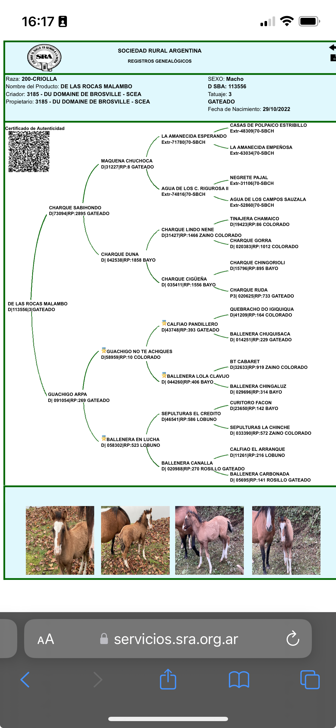 El MALAMBO est une danse fougueuse de la pampa. MALAMBO est un fils de GUACHIGO ARPA, porteur d’une extraordinaire génétique. On trouve plusieurs chefs de race dans son pédigrée tant du côté de son père – CHARQUE SABIHONDO (Chuchoca, Lindo Nene) que du côté de sa mère (Pandillero, Facon). De plus, MALAMBO est d’un superbe modèle, avec beaucoup d’os et de « selo racial ». Il est destiné à devenir l’un des nos étalons et n’est donc pas à vendre. Débourrage en cours …